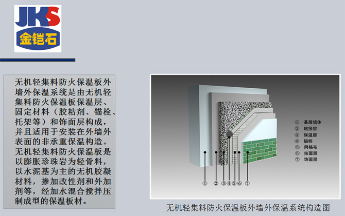 无机轻集料防火保温板外墙外保温系统是由无机轻集料防火保温板保温层、固定材料(胶粘剂、锚栓、托架等)和饰面层构成,并且适用于安装在外墙外表面的非承重保温构造。无机轻集料防火保温板是以膨胀珍珠岩为轻骨料,以水泥基为主的无机胶凝材料,掺加改性剂和外加剂等,经加水混合搅拌压制成型的保温板材。