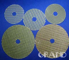 增强型玻璃纤维砂轮网片采用玻璃纤维网布涂以酚醛树脂、环氧改性树脂,经烘干冲切而成,由于裁切采用外径和内孔一次成型,故网片尺寸公差小, 同心度好,周边光洁等优点。产品分为两大类,一类是纯网片,另一类是无纺布复合网片和黑纸复合网片,网片抗拉强度高, 广泛用作树脂粘接剂砂轮的增强基材。用该基材制得的砂轮具有极好的耐热性,高速切割性能及很高的结构强度。尤其适用于做出口砂轮。用于制作砂轮网片坯布的常用规格有CNG5×5-260,CNG6×6-190,CNP8×8-260,CNG14×14-85;网片外径尺寸规格有Φ74±1,Φ96±1,Φ122±1,Φ146±1,Φ196±1,Φ246±1,Φ296±1,Φ346±1,Φ396±1, 内径尺寸规格有Φ17±0.5, Φ23±0.5, Φ26±0.5, Φ33±0.5, 也可根据客户要求进行生产。